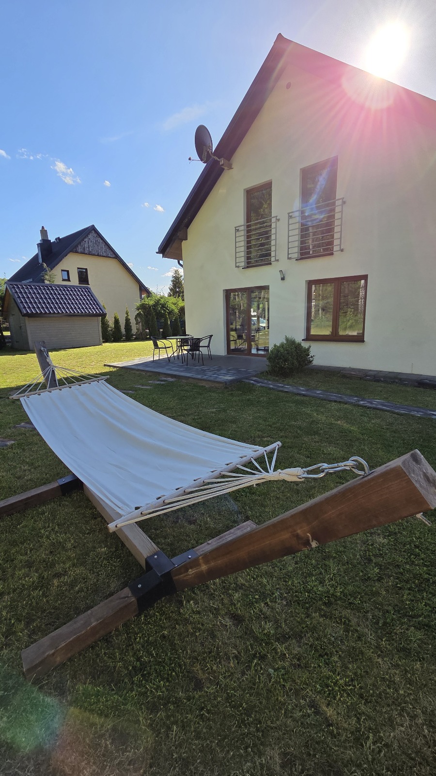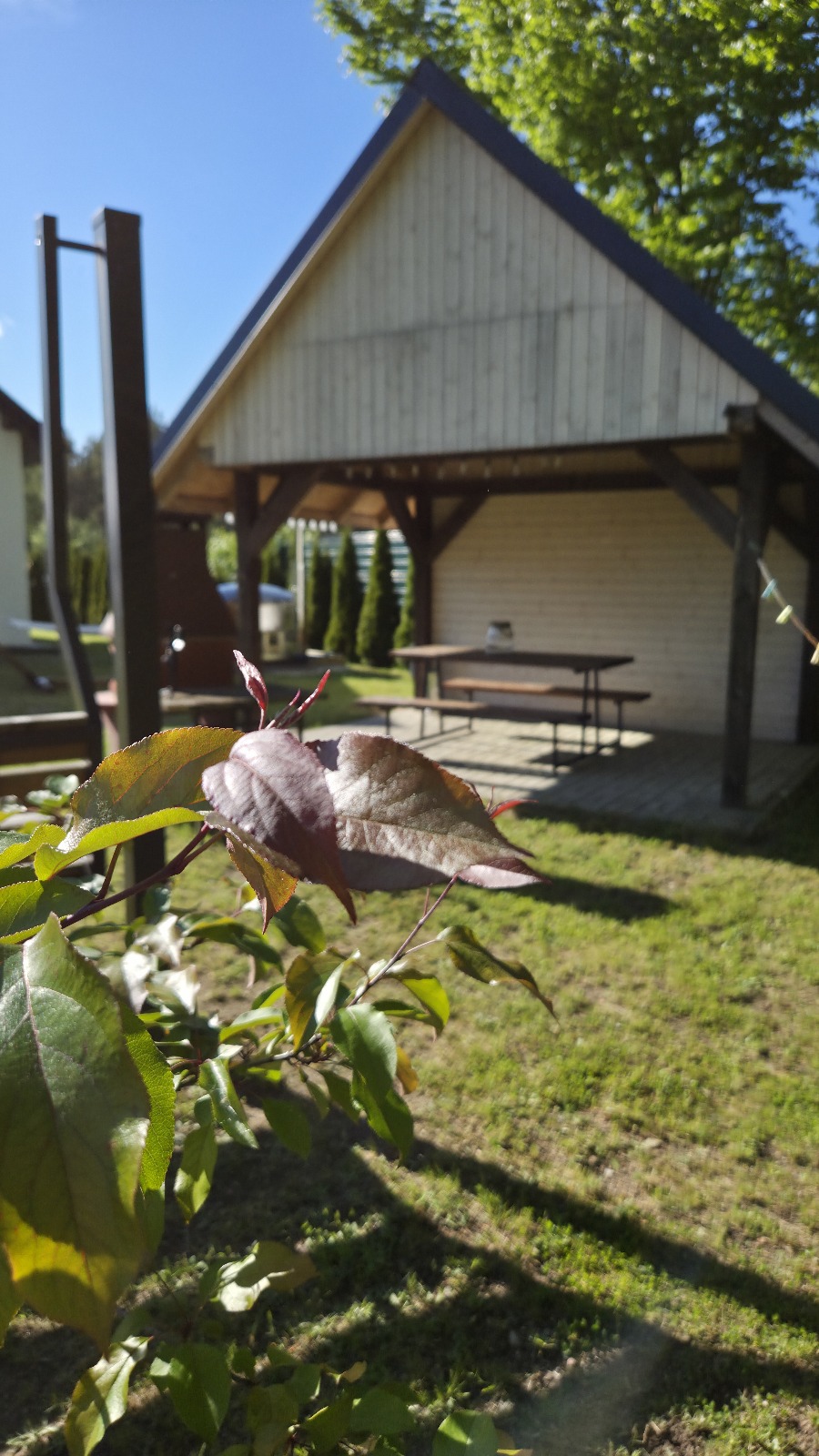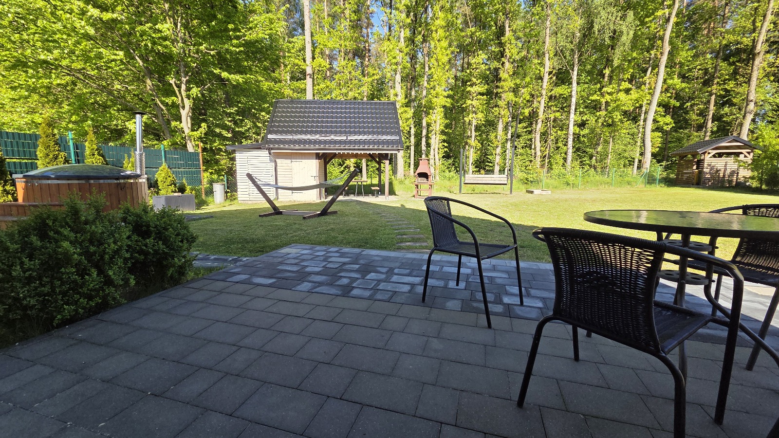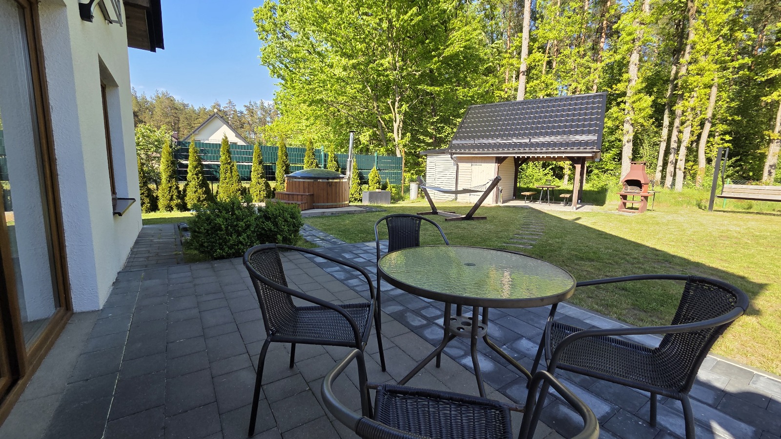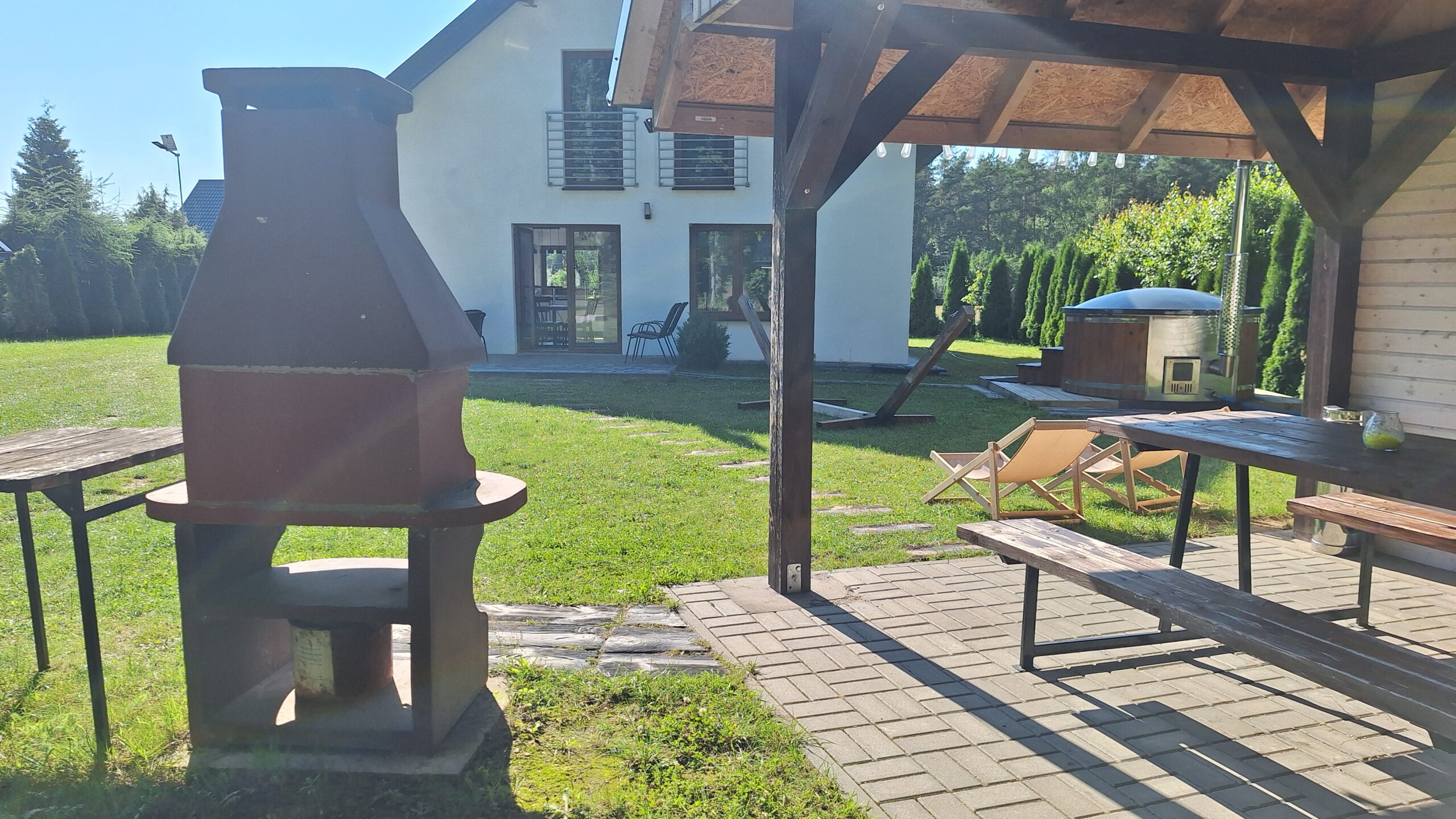 gdzie do państwa dyspozycji – altanka z oświetleniem , murowany grill, meble ogrodowe, huśtawki, piaskownica, parking, własne wejście do lasu.